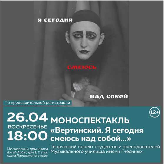 26 апреля 2026 года в 18:00 в Московском Доме книги на Новом Арбате студенты Музыкального училища имени Гнесиных представят моноспектакль «Вертинский. Я сегодня смеюсь над собой...», посвященный легендарному эстрадному артисту XX века Александру Вертинскому.